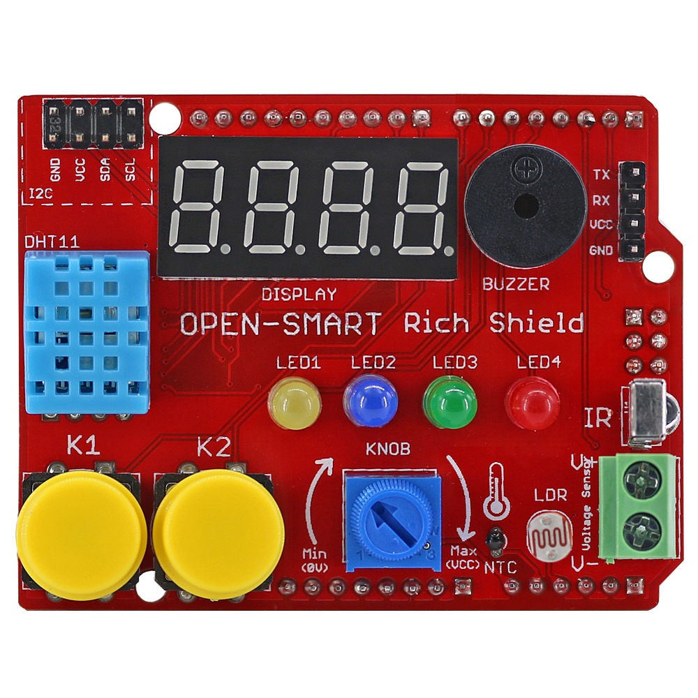 Rich Shield de OPEN SMART AliExpress.com Product – Starter kit Rich Shield with Infrared Receiver LED Buzzer Button DHT11 Light Sensor Temperature Sensor Module for Arduino UNO R3
