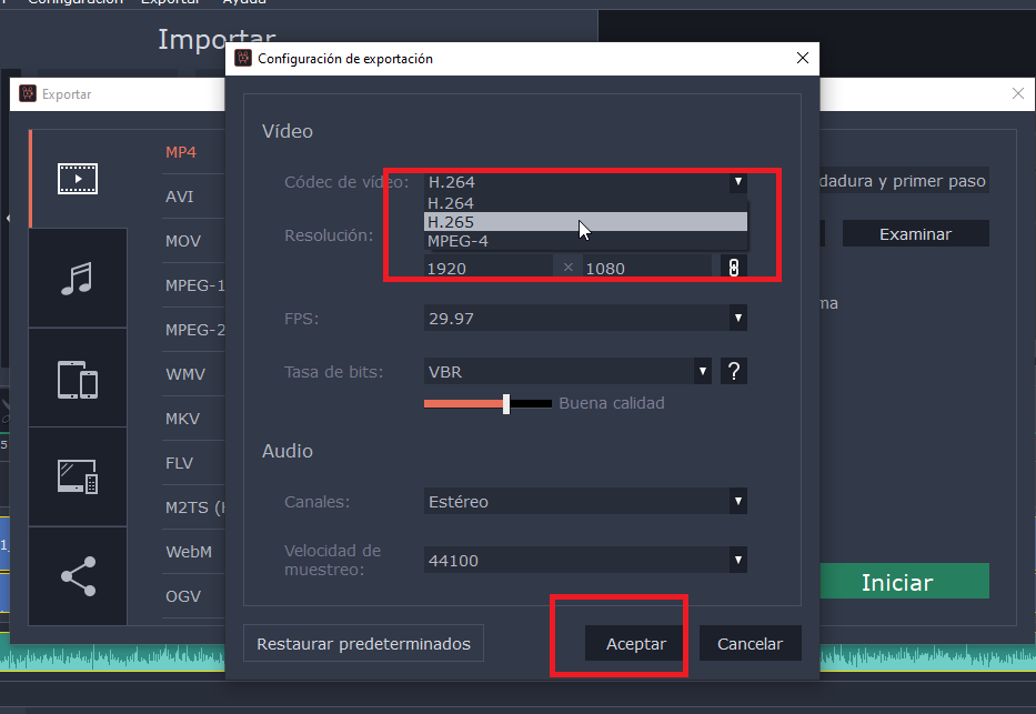 Exportar->Exportar vídeo->MP4->Avanzado->h265