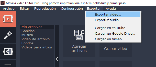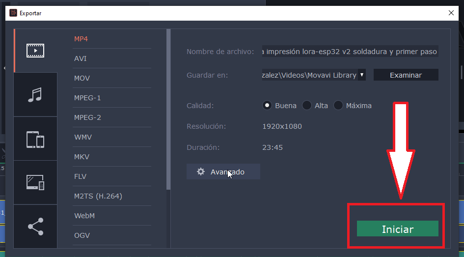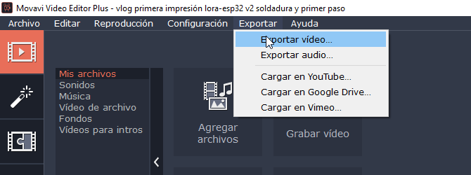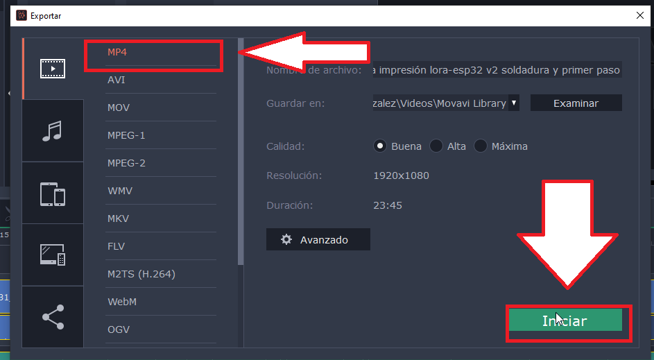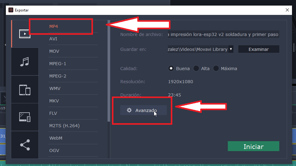 Exportar->Exportar vídeo->MP4