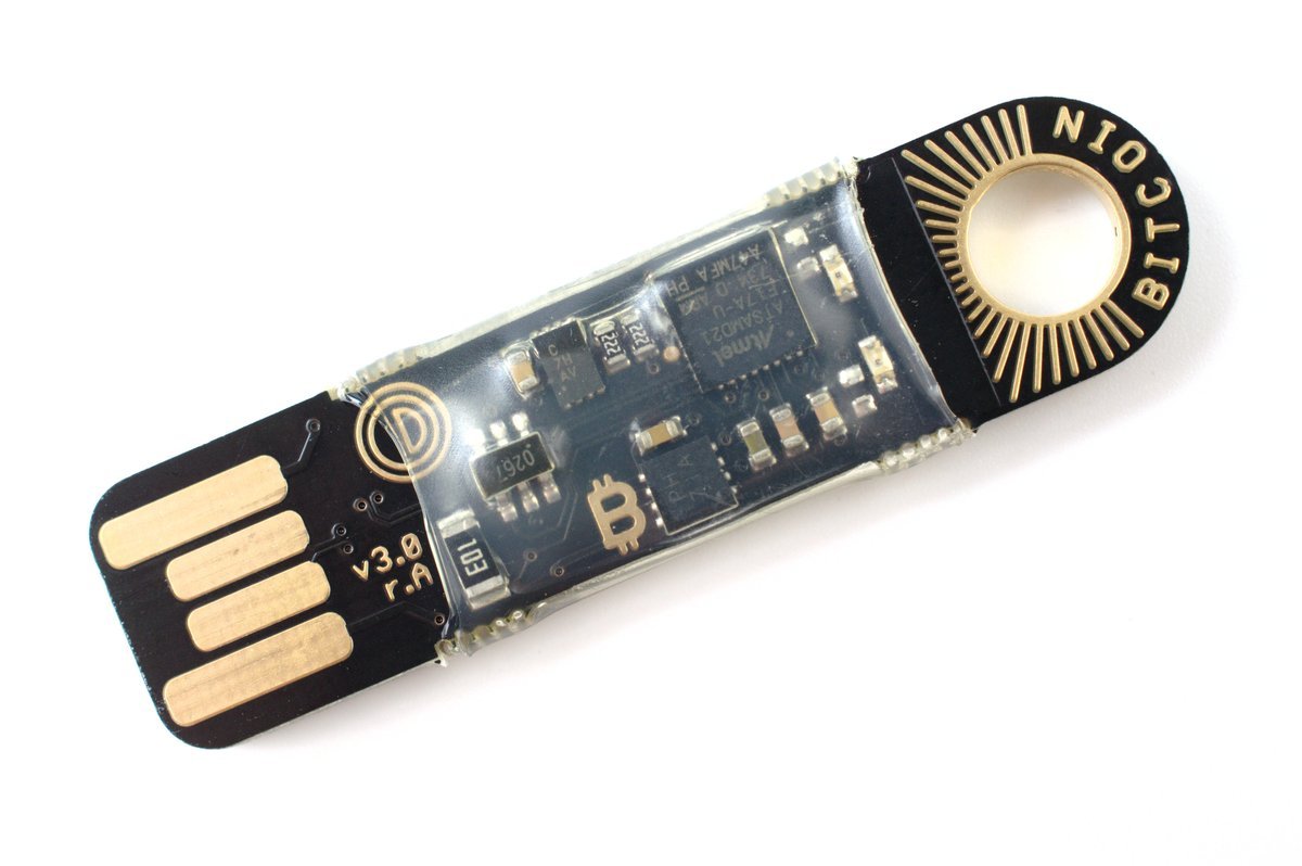 El aparato en cuestión es un miniordenador, basado en algún tipo de microcontrolador, como Arduino, que básicamente lo conectas a tu USB y te da una dirección pública, donde puedes mandar tus Bitcoins.